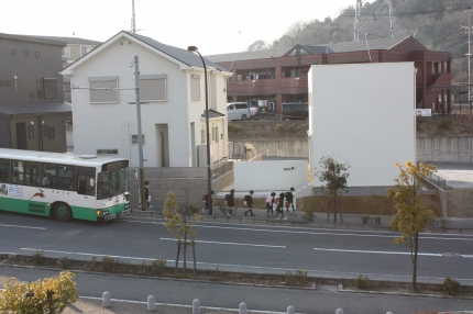 しばし道路向かいの高台よりながめる。バスが来て、小学生たちが降りてきました。