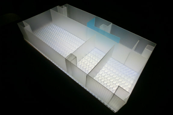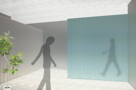 お施主さまができるだけ自然光を生かした明るい空間をご希望されたこと、店名がもつ空を歩く軽やかなイメージ、インソールに用いられる樹脂ハニカムからヒントを得て、3種類の半透明ハニカムパネルを組み合わせた壁面で大小のスタジオやホールを柔らかく仕切るプランになりました。