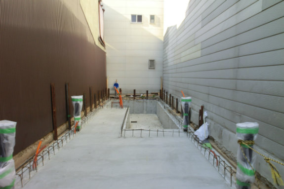 半地下 2014 4/15 『』の家 2014-04-15 狭小住宅の現場。コンクリートがすっかり乾きました。 半地下から。ちょっとした違いですが、普通の1階・2階ではない視線の高さは、なんだか不思議な感覚になりますね。 『』の家