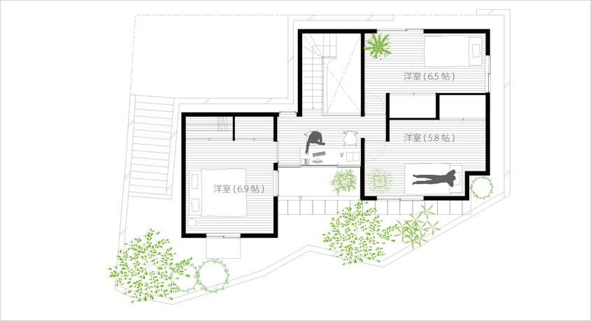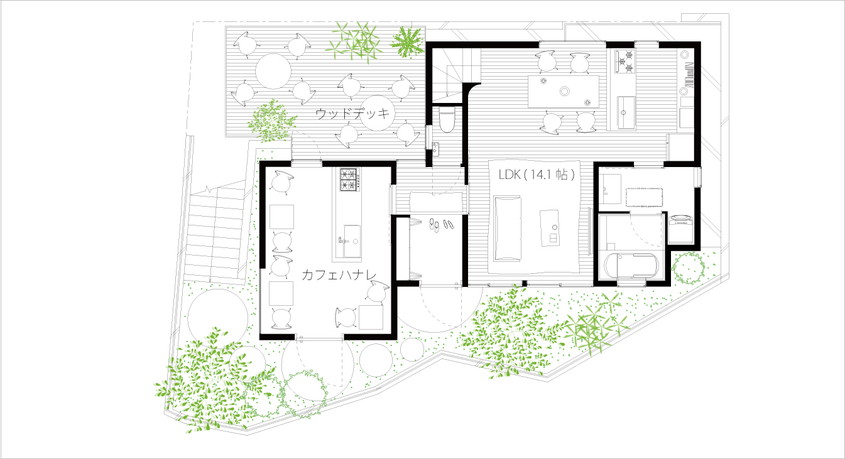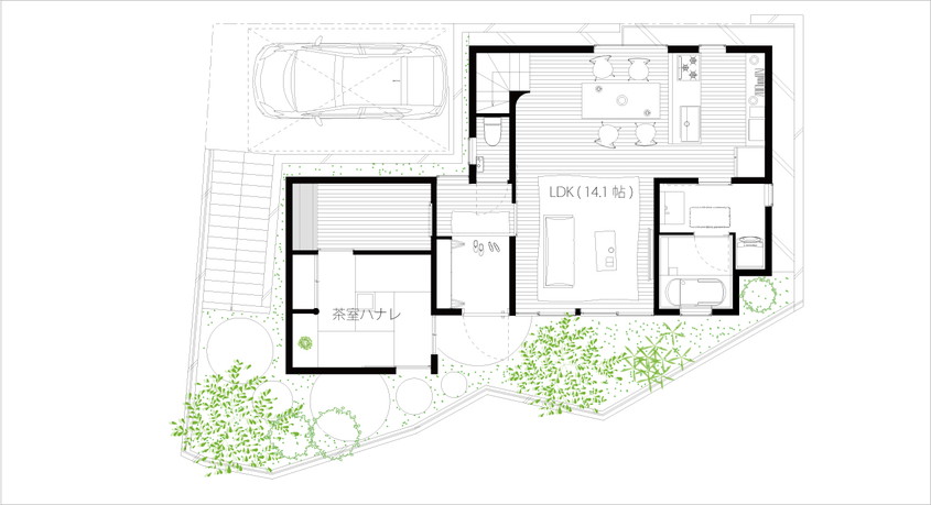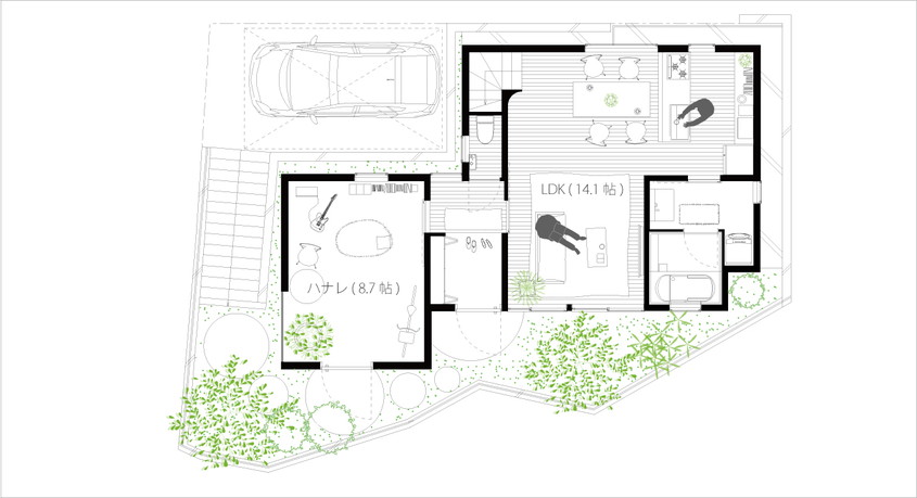 郊外の分譲地の一画、通行量の多い道路に面した立地を生かし、 カフェ、アトリエ、音楽スタジオ、茶室など、様々なアクティヴィティを生み出す「ハナレ」をもつ住宅です。ハナレを道路側に、主棟を奥まった静かなスペースに配置し、住戸1階は南に大きく開いたLDKから緑があふれる庭まで一体的に利用できる開放的な設えとしました。2階は階段室を中心に吹抜を設けて、どこにいても家族の雰囲気が伝わる間取りとし、日当たりのよいバルコニーに面してライブラリスペースも確保しています。シンプルでありながら、多様なライフスタイルに応えることができる住宅です。