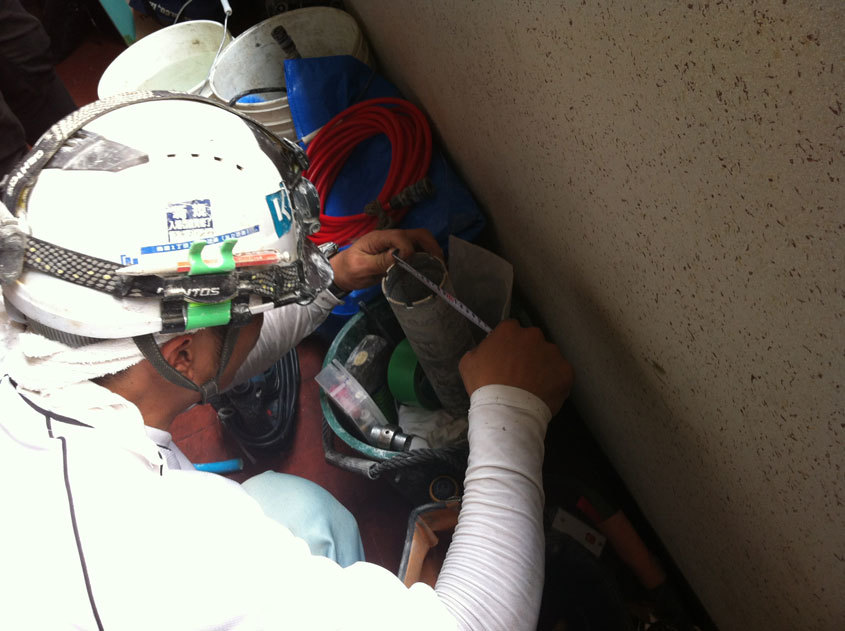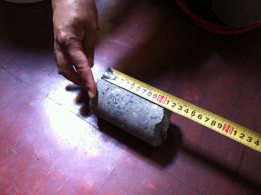 中身が詰まっている、綺麗なコアが抜き取れました。壁の仕上げに使われているモルタル部分などを切り落とし、検査場に持ち込みます。目視ではとても状態が良いように感じましたが、どのような検査結果が出るのかドキドキします。