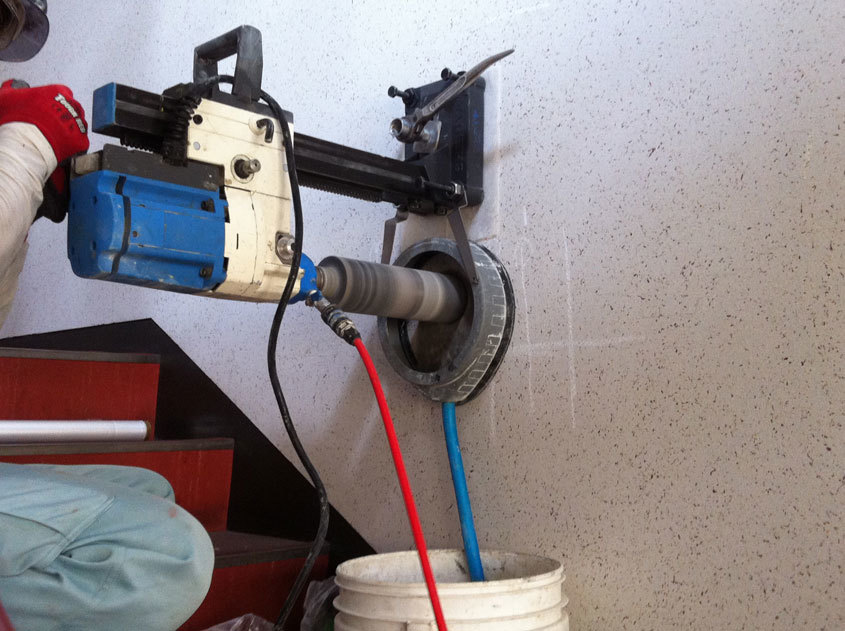 コア抜きの過程でコンクリートの粉が大量に出ますが、機械にホースを繋いで水を循環させることで、粉塵が周囲に飛ぶことなく作業を行う事が出来ます。