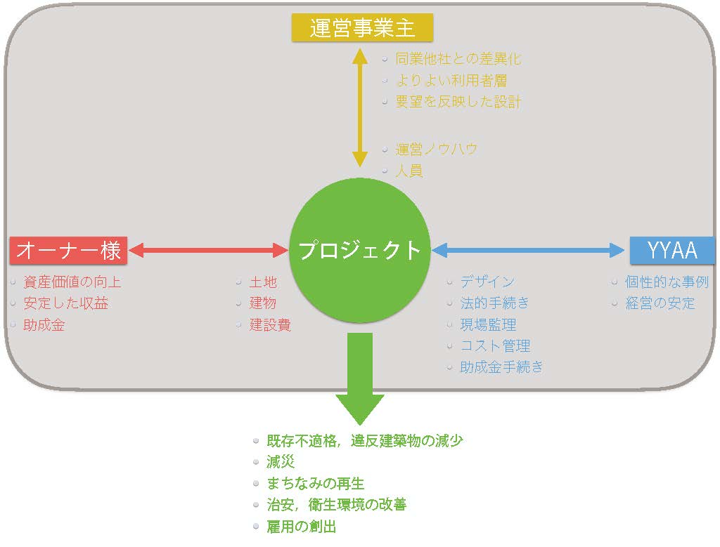 これは一つのプロジェクトに対して、土地建物のオーナー様・わたしたちYYAA・運営事業主様がそれぞれどういったものを提供できるのか、逆にそこからどういったものを受け取れるのか、を図示したものです。プロジェクトの規模が小さい時や、オーナー様がその建物で営まれる事業の運営事業主も兼ねる場合(すなわち、いままで行ってきた事業をそのまま継続する場合)は、上図の赤の部分と青の部分のみで計画が成り立ちます。プロジェクトの規模が大きくなり、従来と異なる事業内容に転換する必要性がある場合はその新しい事業の運営ノウハウを持つ事業主様にも加わっていただいて、三つ巴の図式となります。