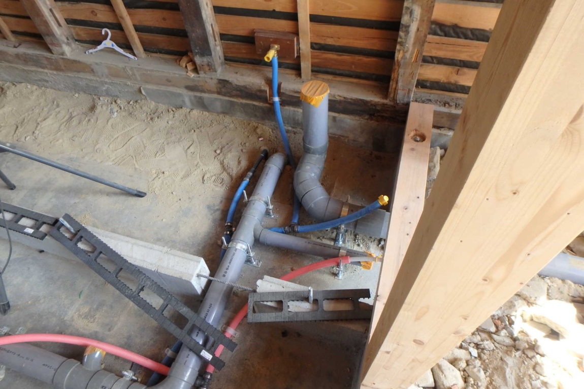 まずは床下の工事から。耐震補強と給排水配管の仕込みを行っています。心配した排水管のルートもうまく確保できました。