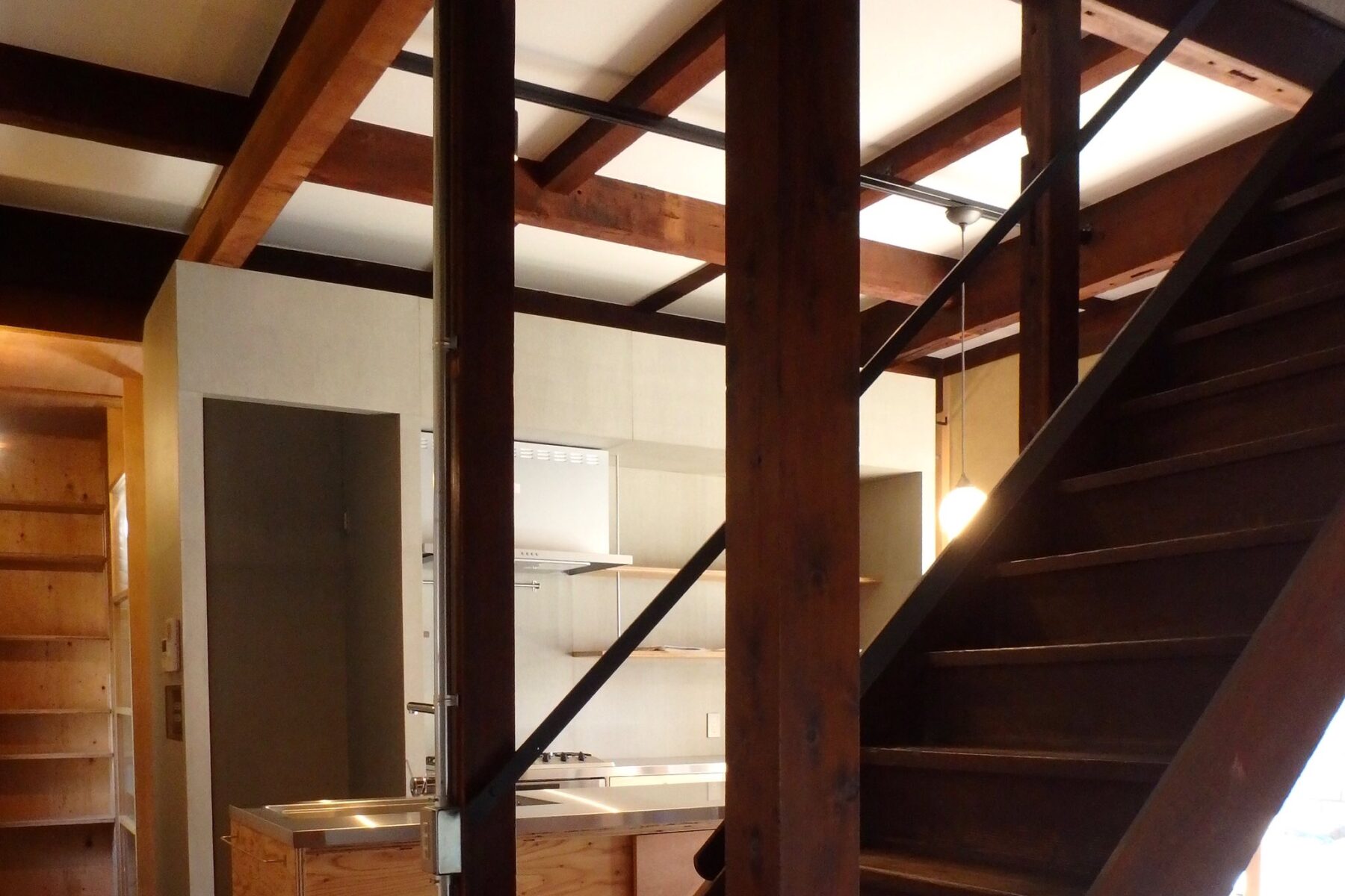 当初、階段の両側は土壁のまま残す設計でしたが、お施主さまの提案で取り払ってオープンにしました。空間に広がりが生まれて大正解でした。