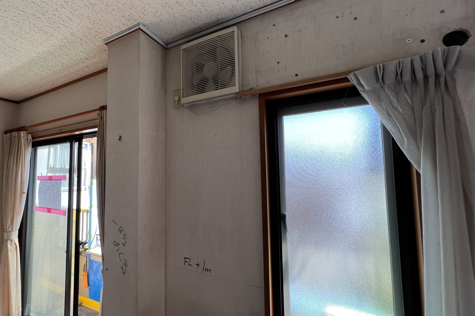 LDKの一番メインとなる壁面に、窓と大きな換気扇と鉄骨柱がありました。