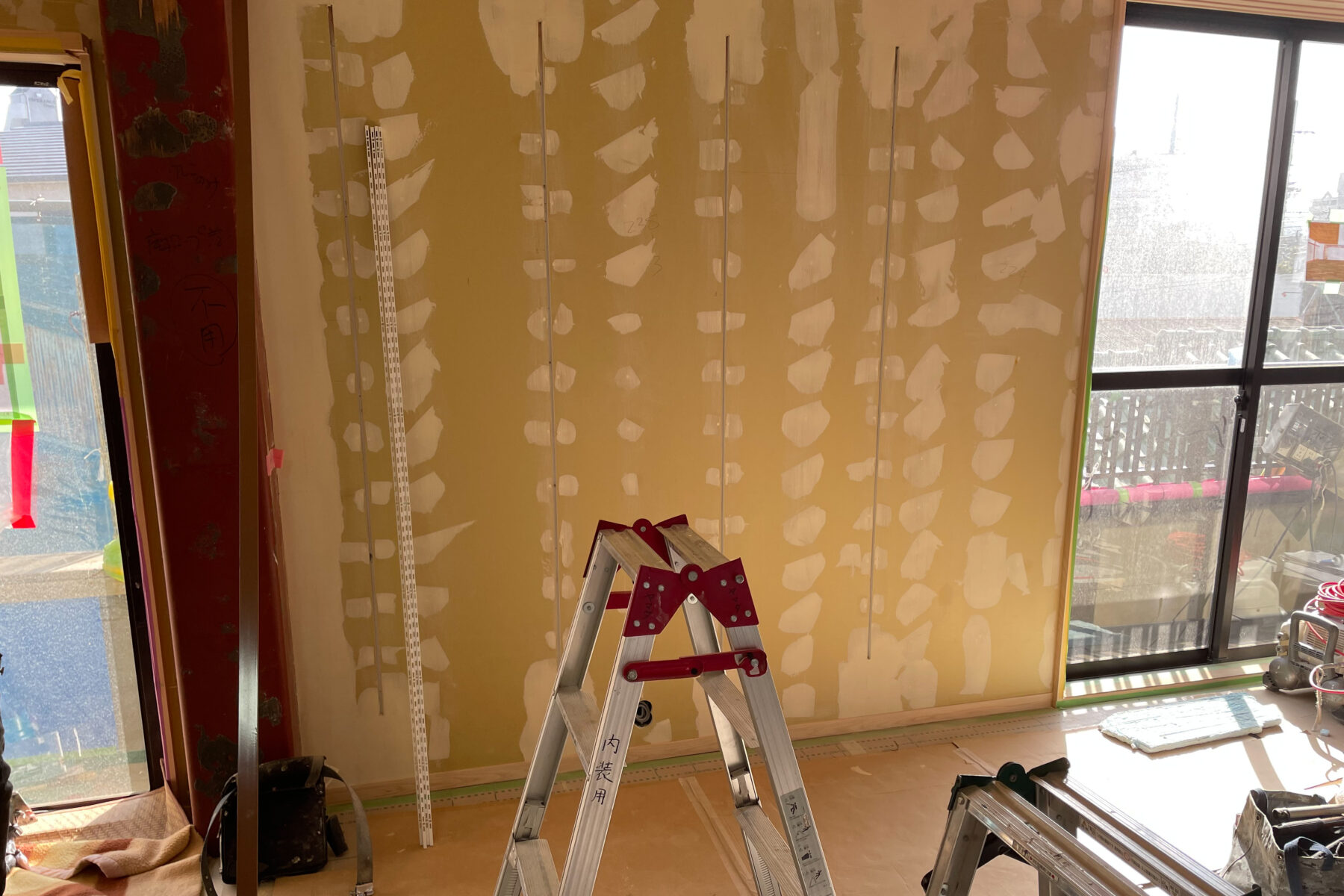 窓と換気扇は塞いでスッキリ出来ましたが鉄骨柱は無くせません。丸っと隠蔽する案も考えましたがうまくいかず、反対にインテリアの要となるようにデザインが出来ないか、色々検討しました。