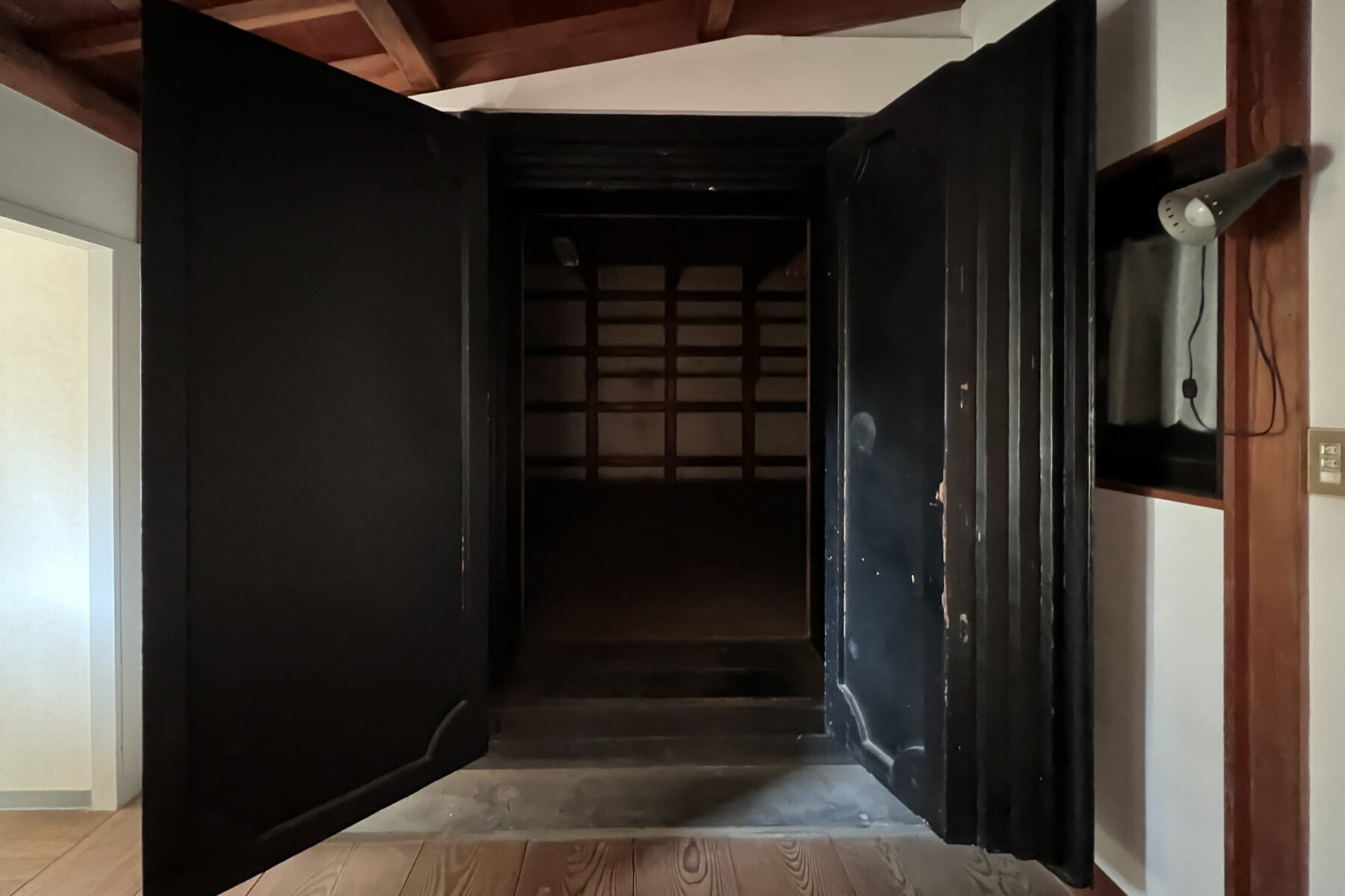 蔵の入り口。元々離れだったものがリフォームで室内化されています。雨漏りの原因になっているので再び切り離す設計です。ちなみにこの30cmぐらいの厚みの扉は、「戸前(とまえ)」と言うそうです。