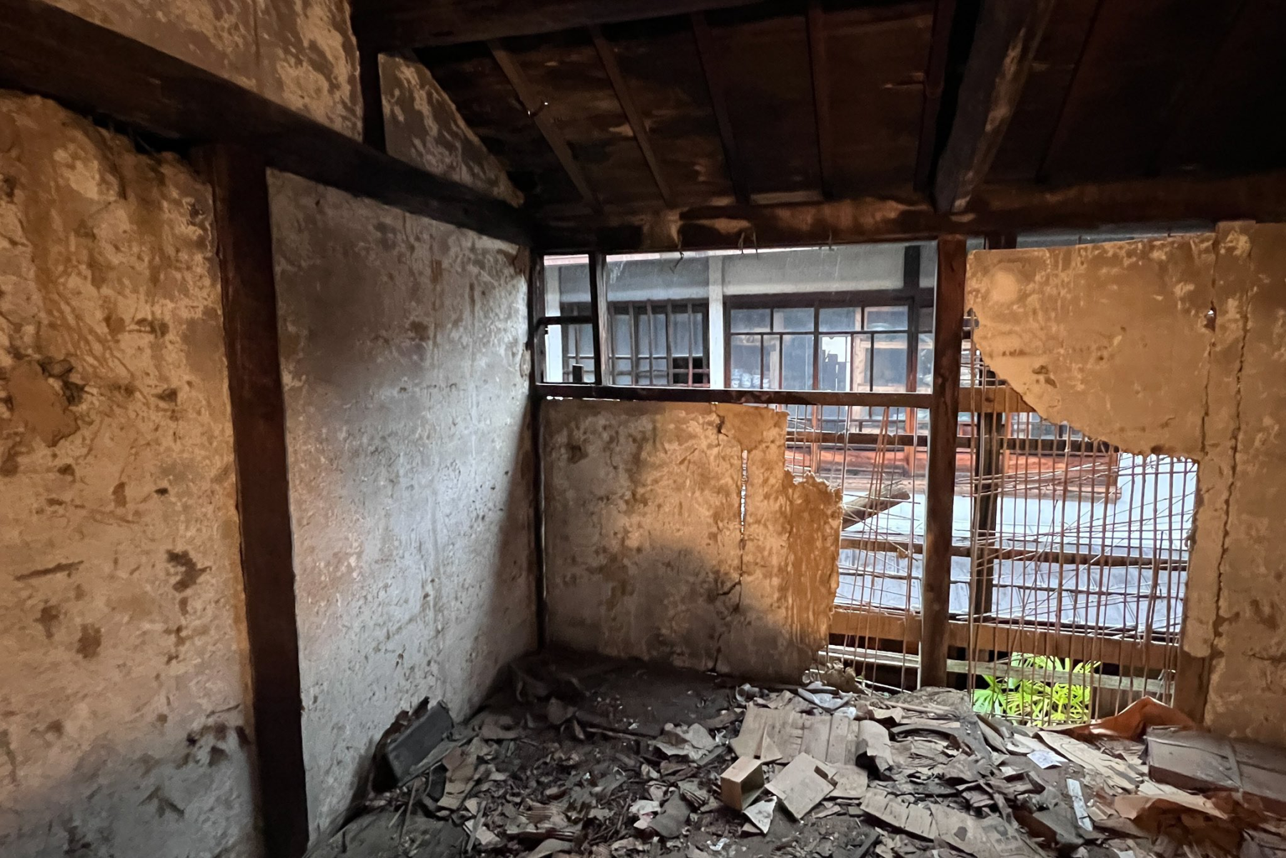 片付け完了。 2024 12/04 046 ココナガヤ 2024-12-04 満載だった清水焼きの在庫の片付けが終わり、室内がついに空っぽになりました。 最近の雨風の日に壁や窓が一部崩落してしまい、本当にリノベ出来るかどうかの瀬戸際でした。何とか補助金の着工前手続きが終わったので、急いで足場を組んで応急措置から行っていきます。 046 ココナガヤ