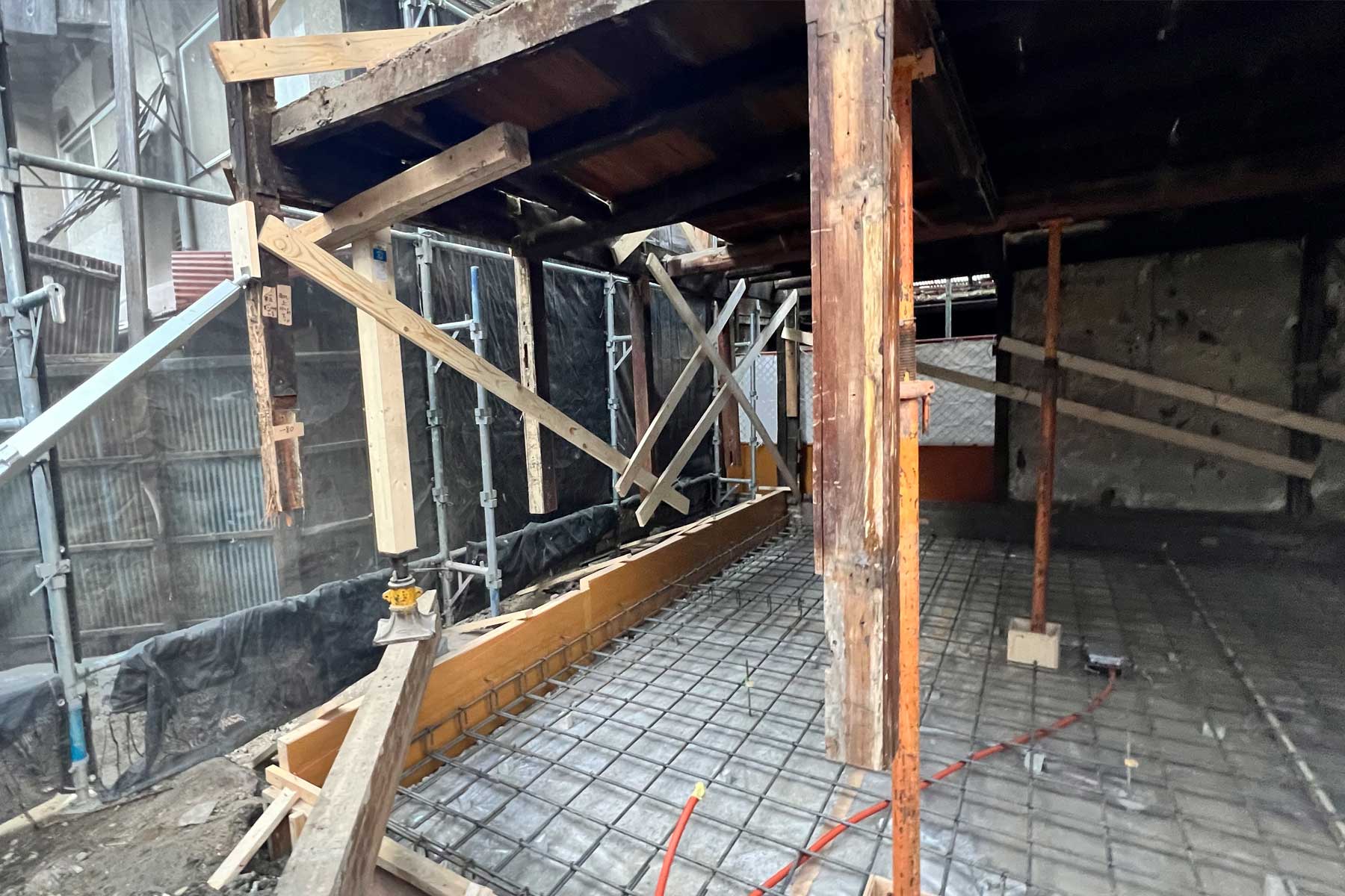 基礎配筋。状態の悪い古民家改修ではリスキーな状況を荒技で乗り越えねばならない事も多々あります。とはいえ、通り一列全部空中に浮かせる工事はさすがに初めてです。柱の根元が腐って床が下がりつつある危険な状態だったので、基礎が出来上がったあとでジャッキアップをかけ、新しい柱に入れ替えます。古民家改修に慣れた工務店さんに感謝!