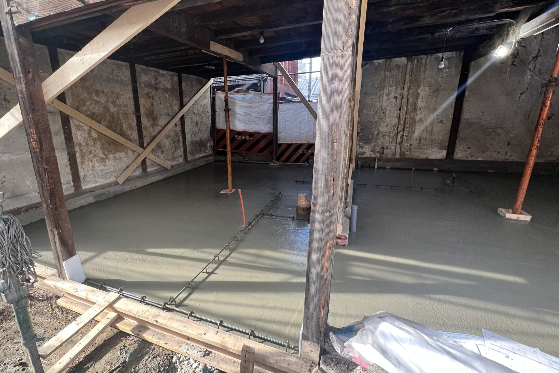 道幅2.7mのコンクリート打設 2025 3/26 046 ココナガヤ 2025-03-26 コンクリートの打設中。昭和小路は朝から大変な事になっています。住民の皆さまにもご協力頂き、なんとかポンプ車が近くまで入れて助かりました。ありがとうございます。 室内はヒタヒタにコンクリートが流されています。各室とも1階は土間仕上げとなる予定です。 046 ココナガヤ リノベーション 京都 古民家 町屋 長屋