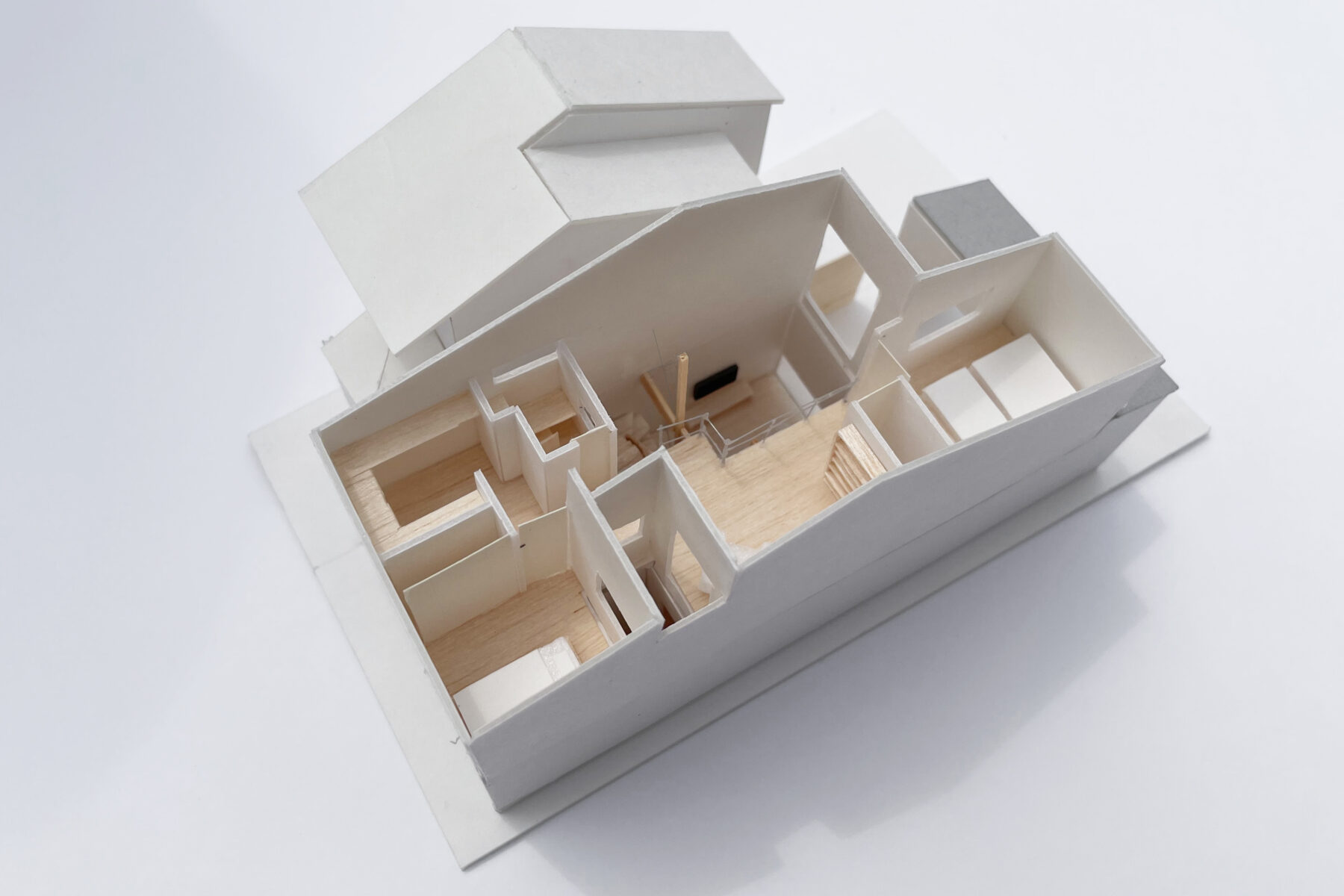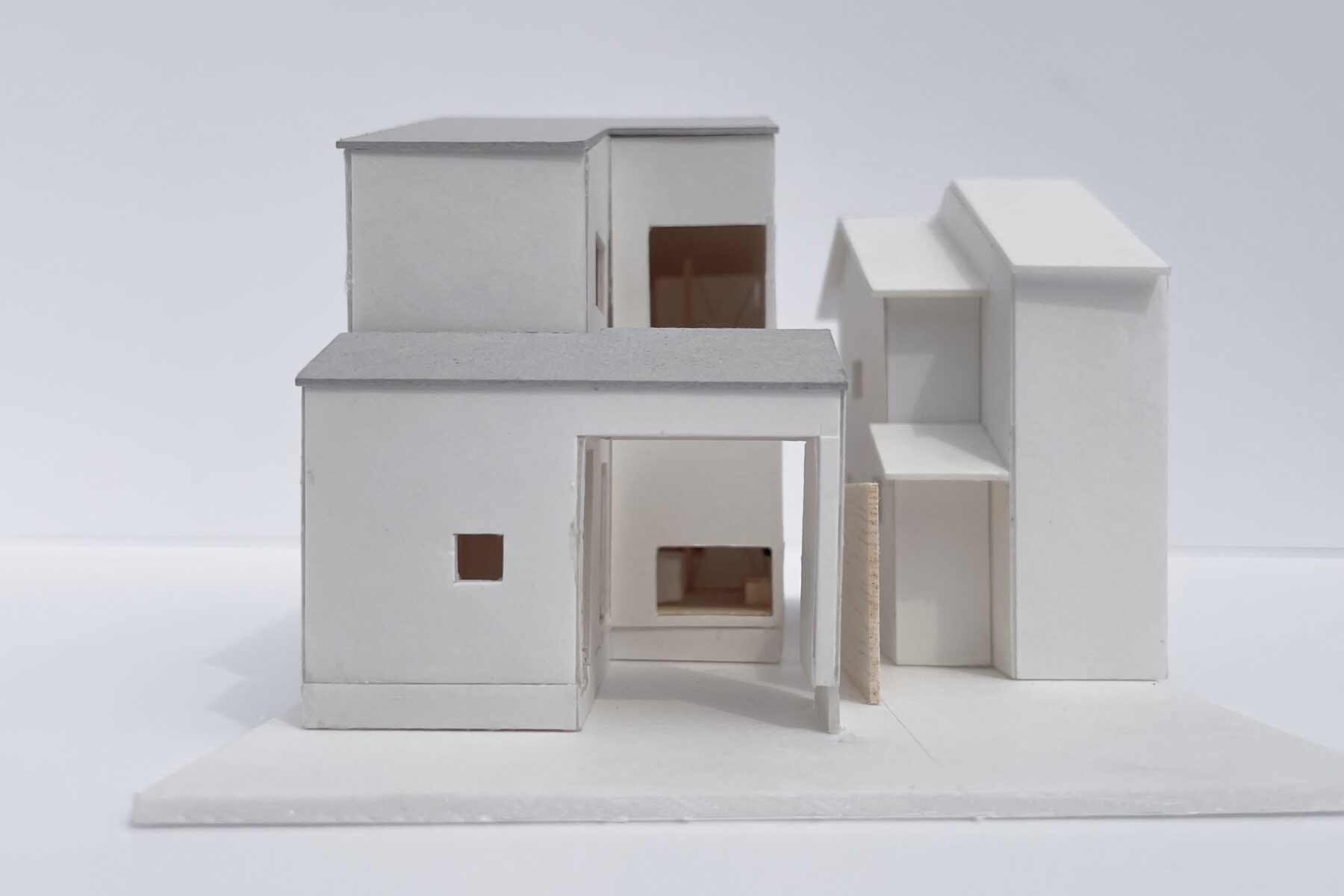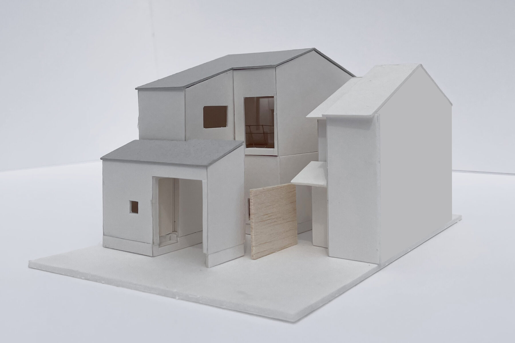 京都市宇治市。若いご家族のための住宅の計画です。南北に細長い敷地形状、かつ周りに住宅が建て込んでいる条件のため、建物を「己」の字形に配置し、前庭と中庭を設けて奥まった居室まで通風・採光を導いています。