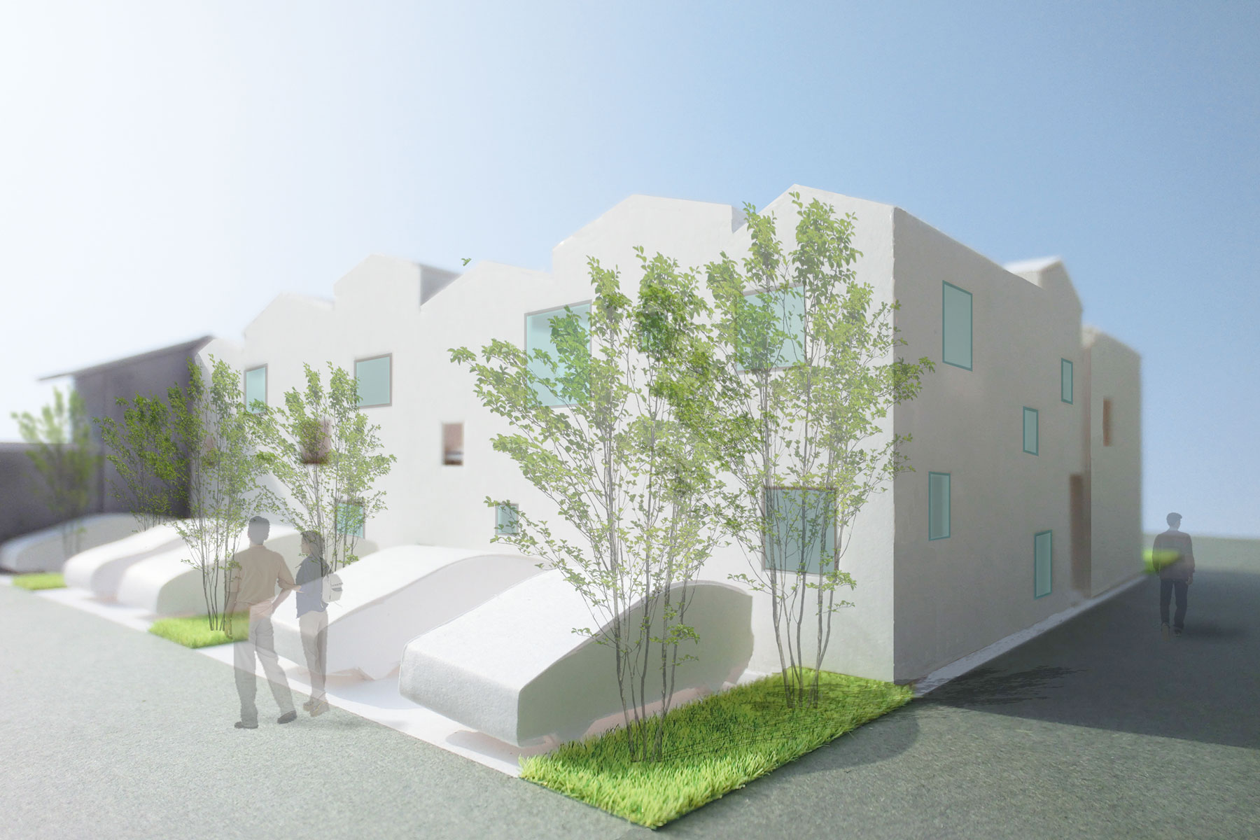 大阪市東住吉区。古い長屋と再開発マンションが混在する下町。道路で囲まれた1つの街区丸ごとを再生する計画です。建築基準法・都市計画法の規制とコストのバランスを取りながら設計を進めるうち、周辺に散在する長屋とスカイラインを揃えた、なんとなく古いような新しいような外観になりました。内部は全住戸の間取りや広さがバラバラ。若いファミリーや単身高齢者など様々な入居者が一緒に住める環境をつくる試みです。