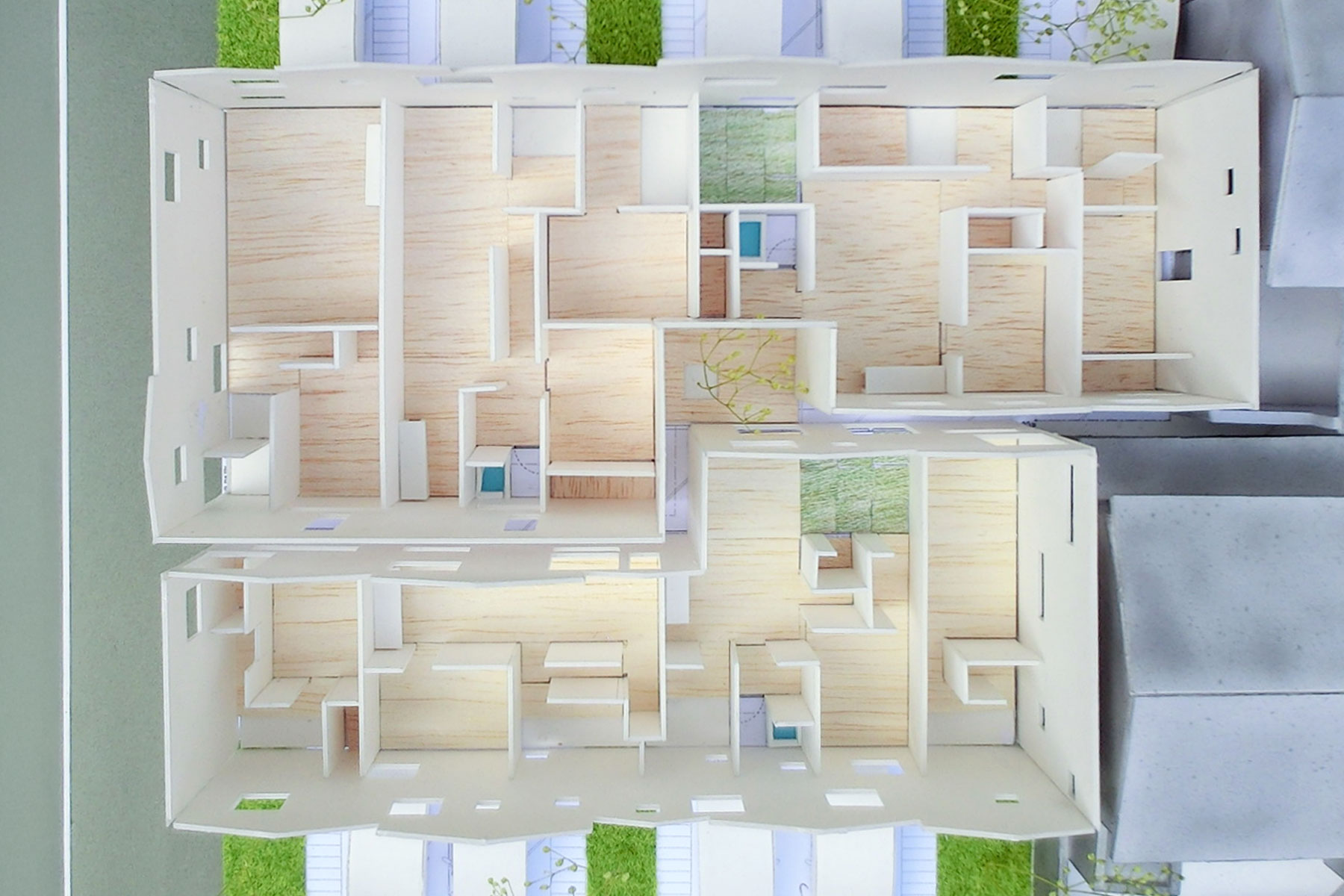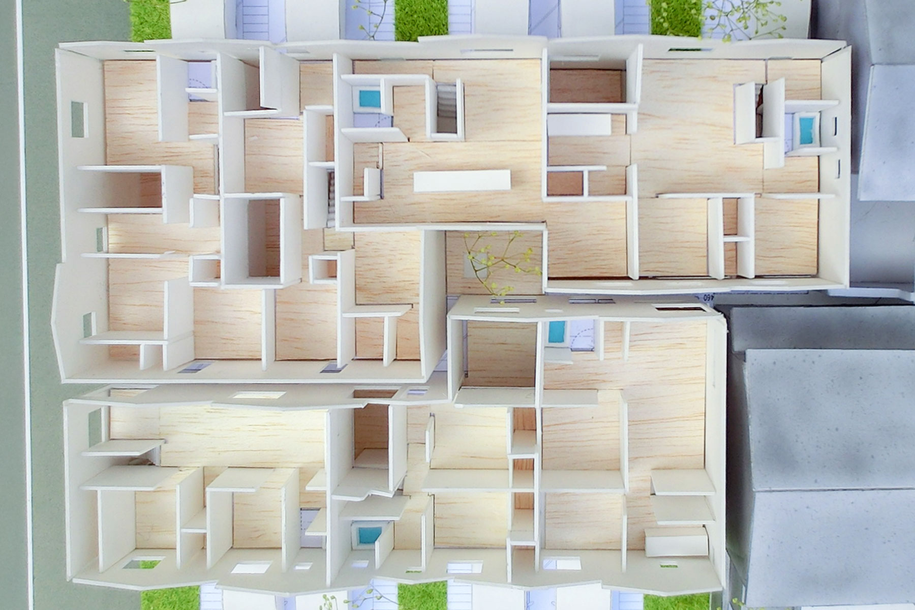 俯瞰。大小のトップライトを設け、密集部分にも光を届ける。