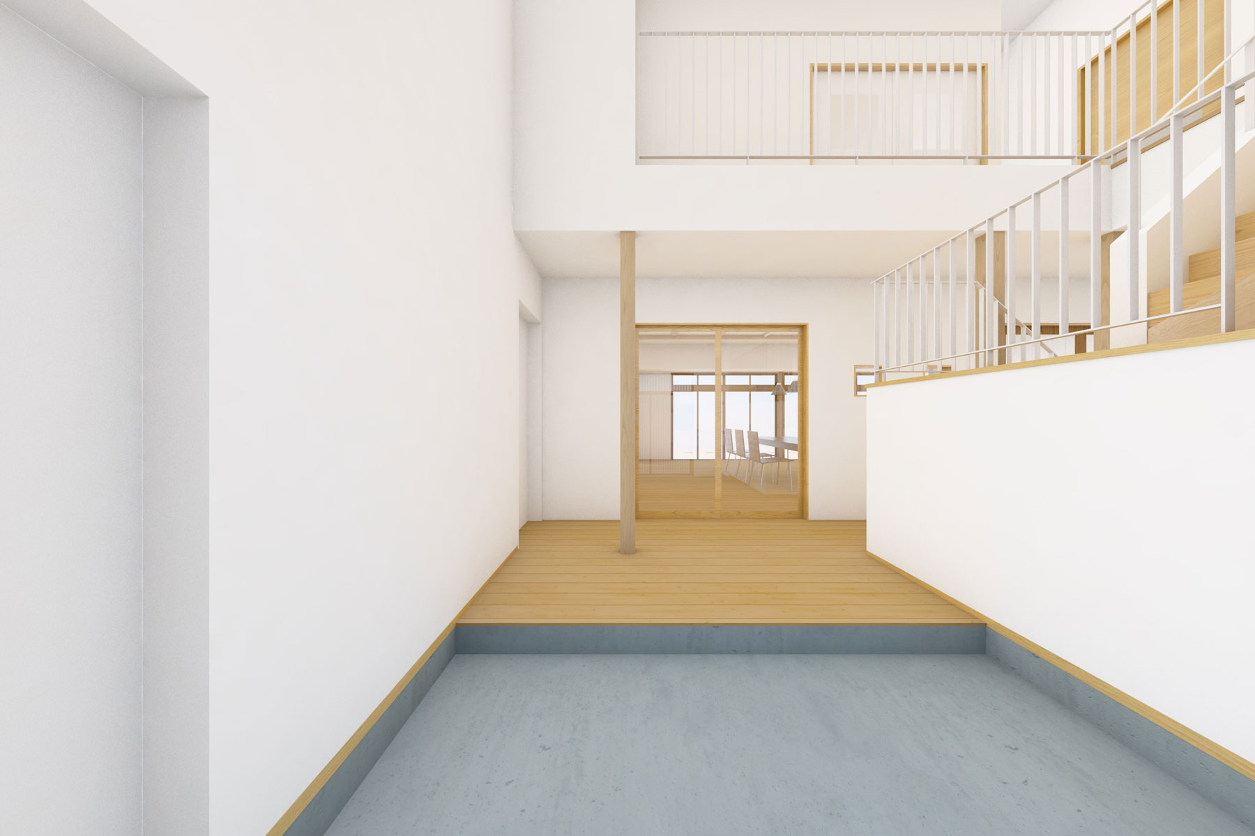 中古で購入された比較的新しい戸建住宅のリノベーションです。平成期の建物のため外壁や屋根はそのまま残し、若いご夫婦と子どもが快適に生活できる間取りに再編します。30帖オーバーの大きなLDKが南面の庭と良い関係性を保ちつつ、円滑な家事動線によってLDKとガレージがつながるように計画しています。廊下から各室にアクセスするクラシックな間取りの構成はある程度残して、コストダウンを図りました。