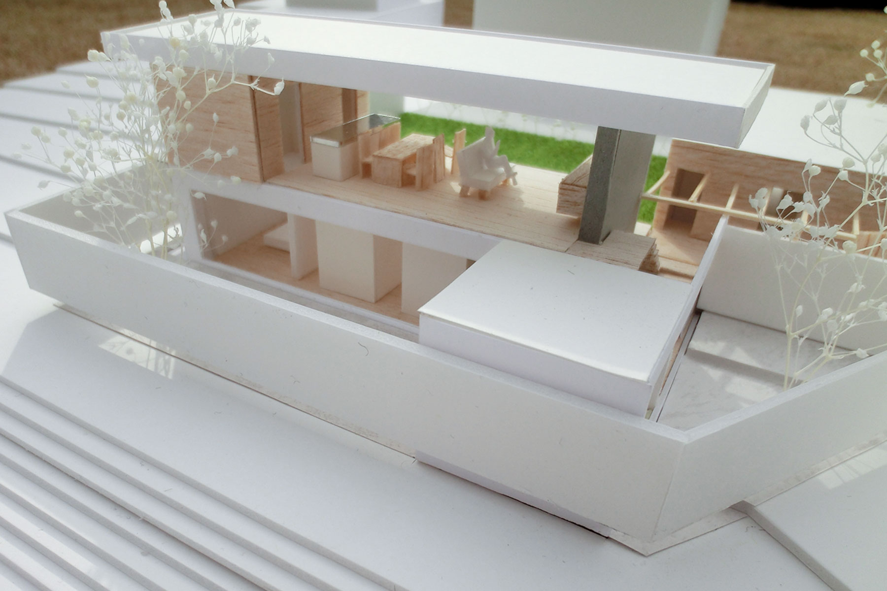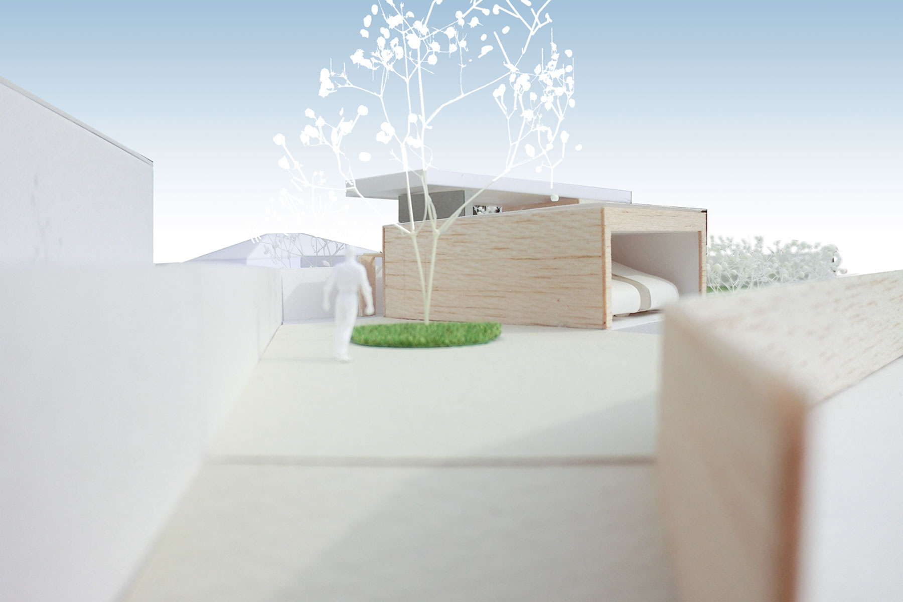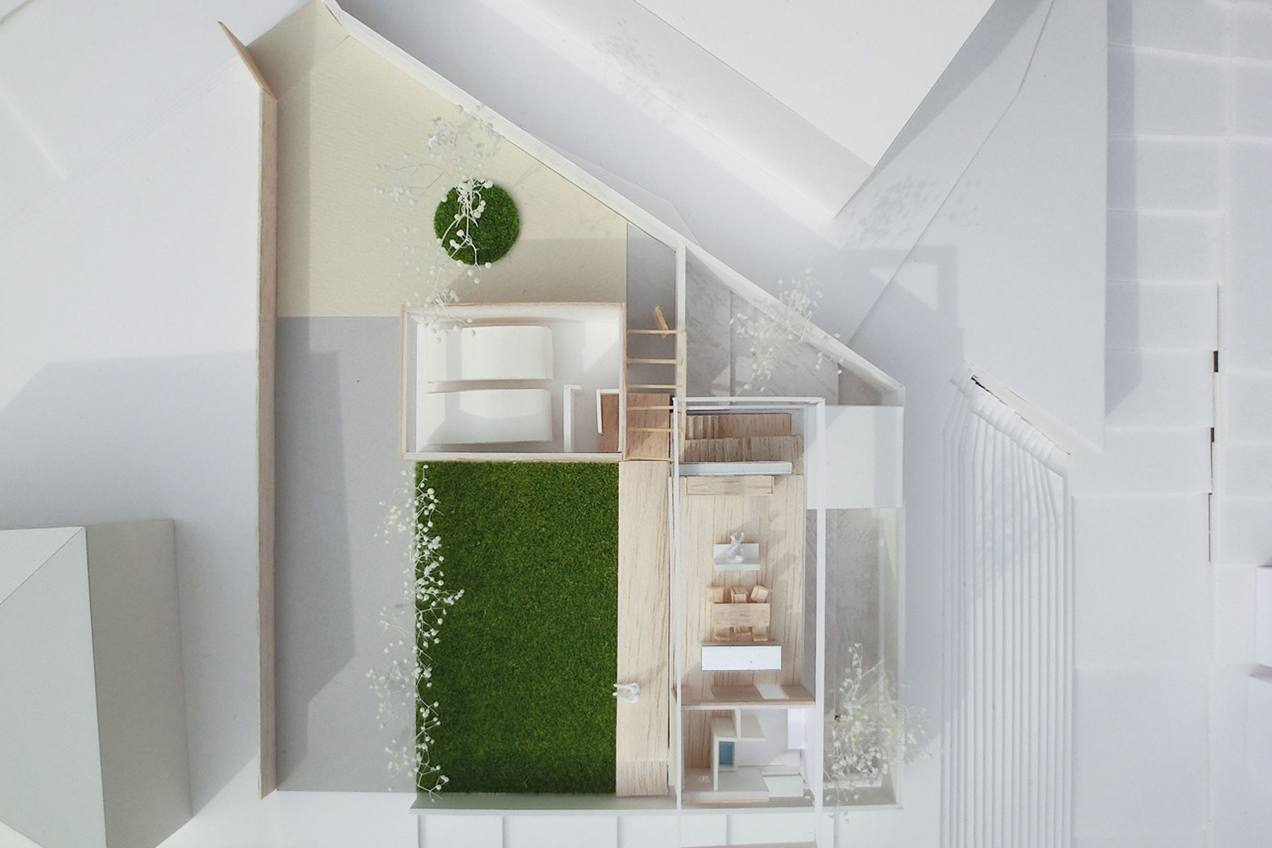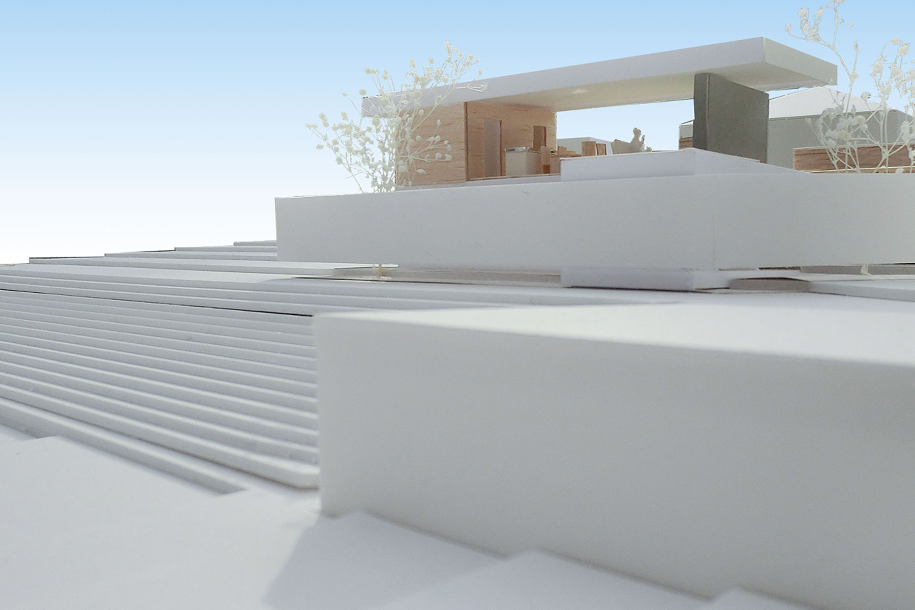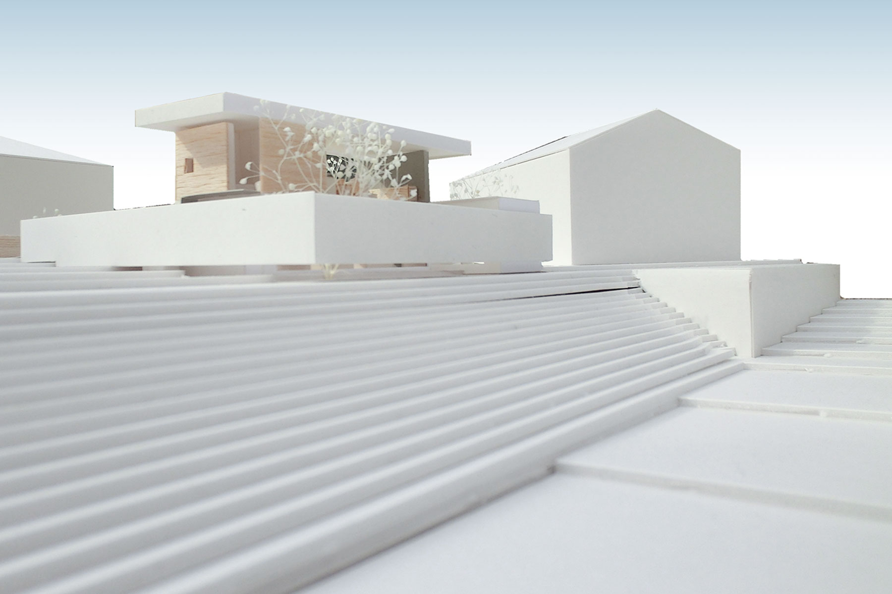 緩やかな丘の斜面に建つ住宅の計画です。見晴らしは非常に良いものの周辺に住宅が点在している条件から、エントランス階より半階上がってオープンな造りのLDK、半階下がってクローズな造りの寝室・和室をスキップフロアでつなぐ計画としました。