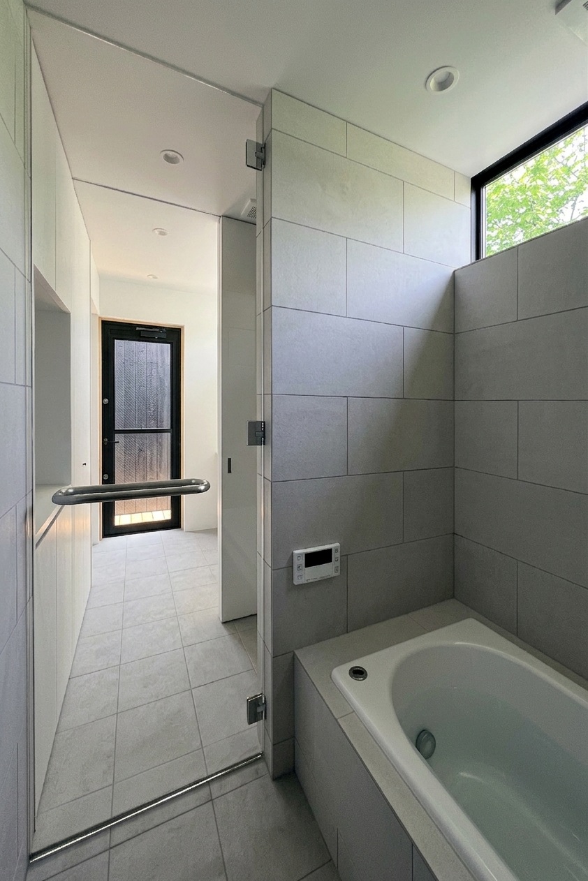 洗面からランドリーを介して浴室へつながるバスルーム。来客時は引戸を閉じてプライバシーを守る。外遊びの汚れを落とせるようにウッドデッキ直結として床はサーモタイル貼り。